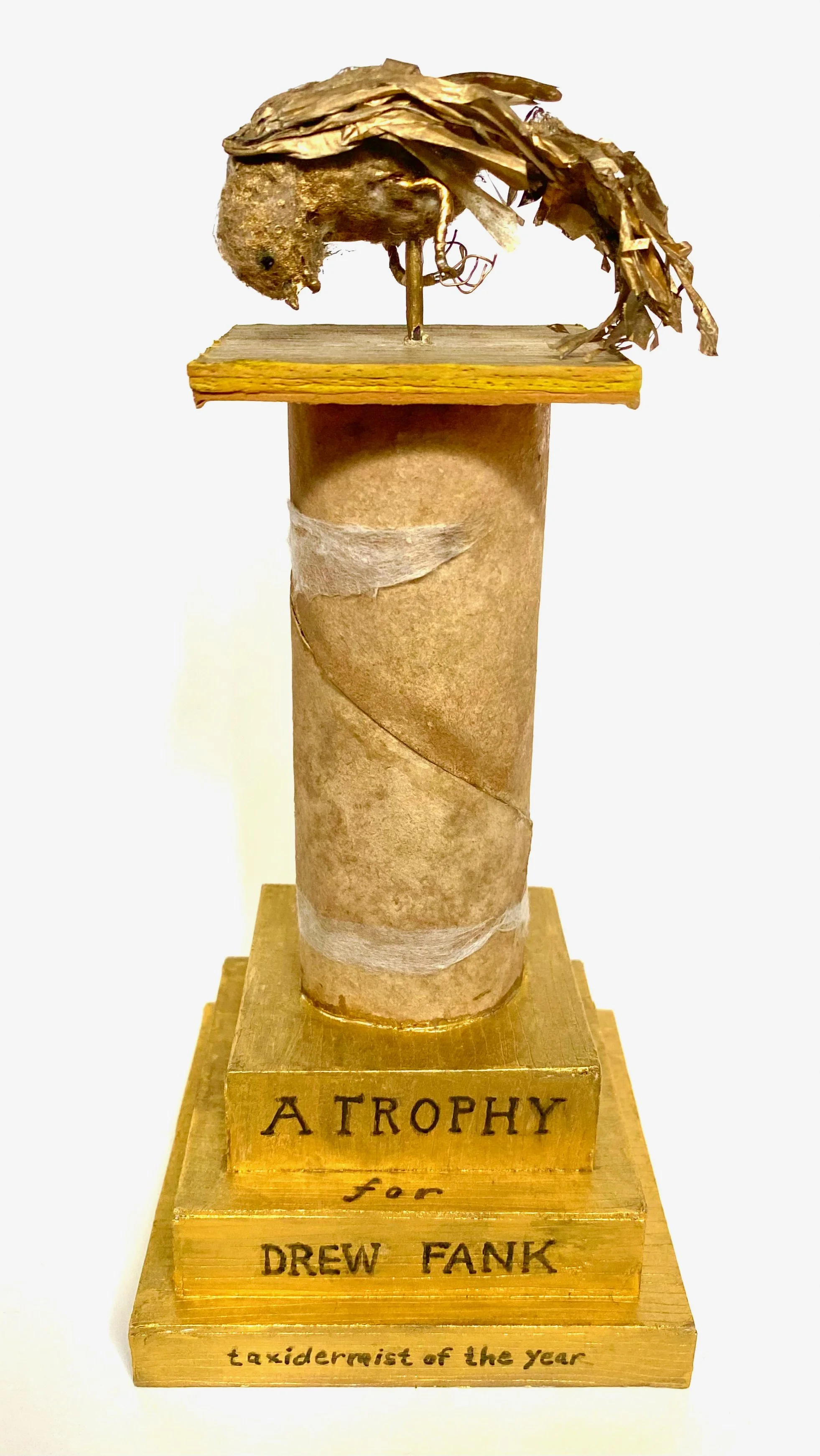 A Trophy, 2011/2024 Inks on embossed cardboard, wire, paper, cotton, and polymer clay; cut, rolled and dyed Bristol board with blotter paper