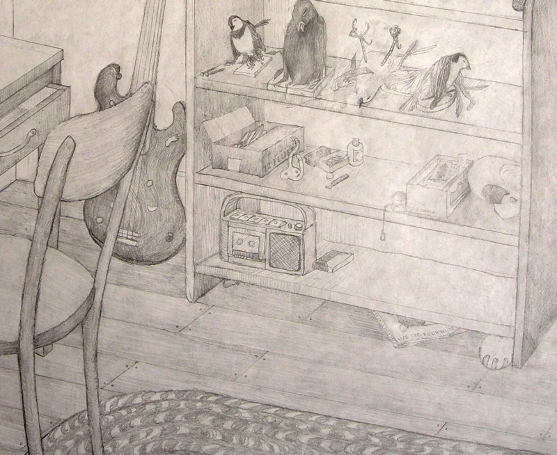 Corner of room sketch, in progress. Pencil on paper